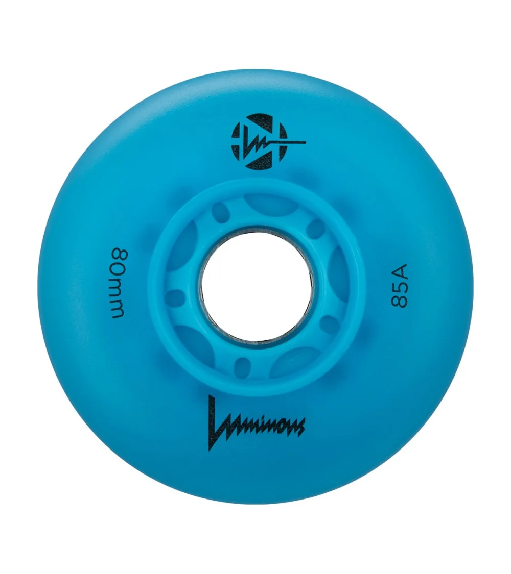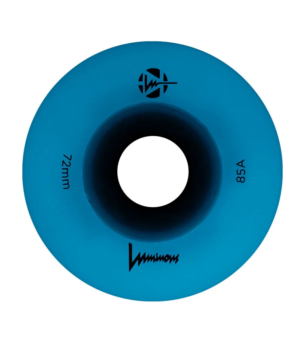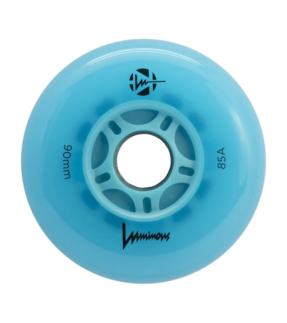 Ruedas LED con iluminación Azul Oceano, disponibles en paquetes de 3 o 4 unidades. Destacan por su intenso brillo azul y brindan el equilibrio ideal entre desempeño y estilo, gracias a su dureza 85A.