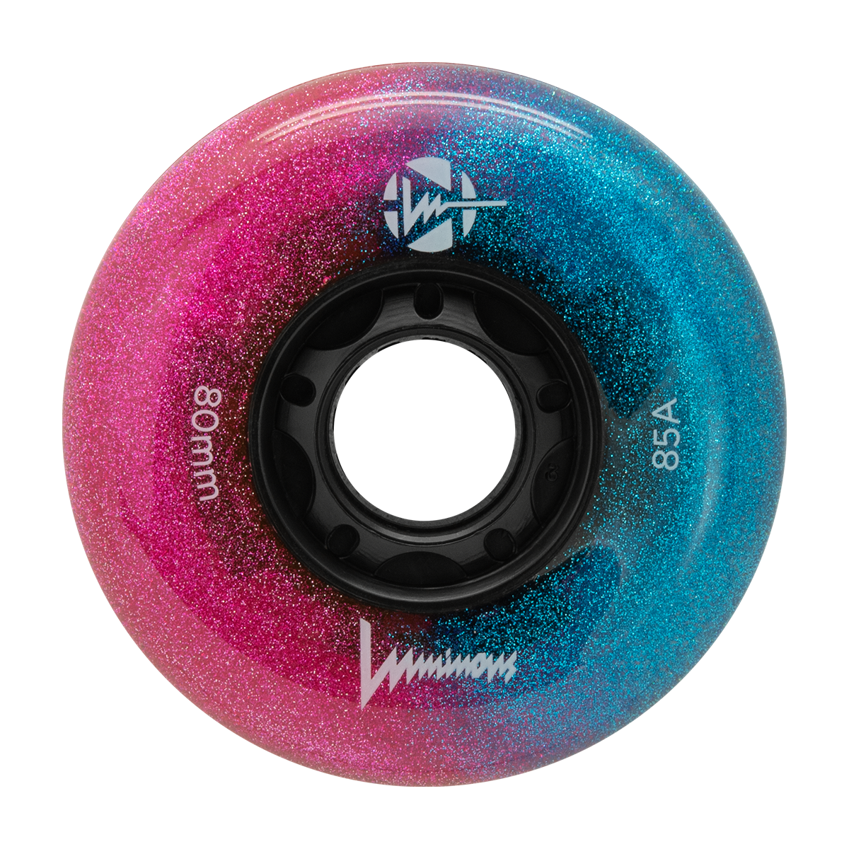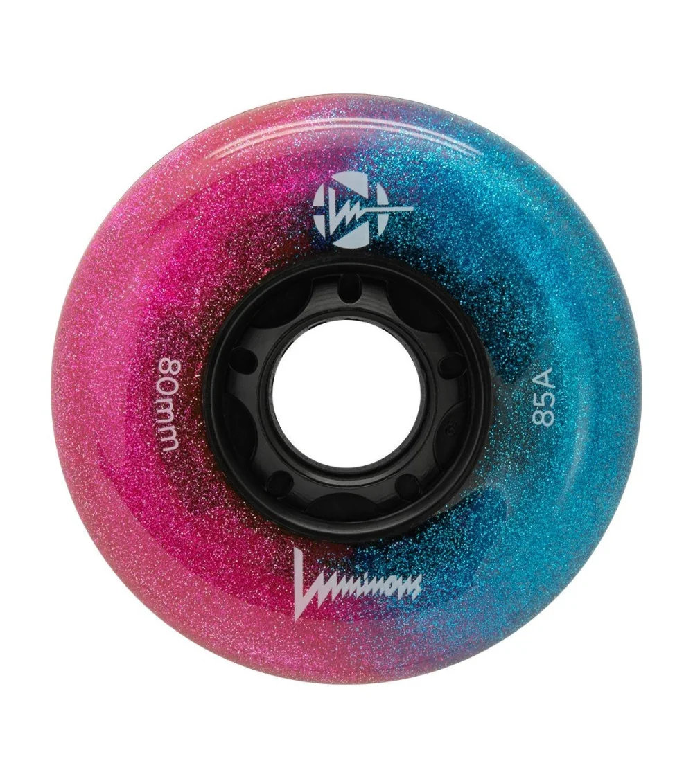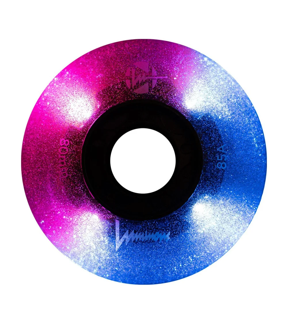 Ruedas LED luminosas Galaxy, dureza 85A, vendidas en paquetes de 4. Presentan una combinación de resplandor azul y rosa, ideales para patinadores que buscan un efecto único y llamativo.