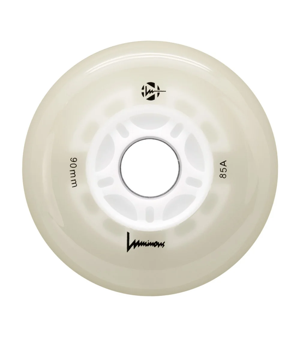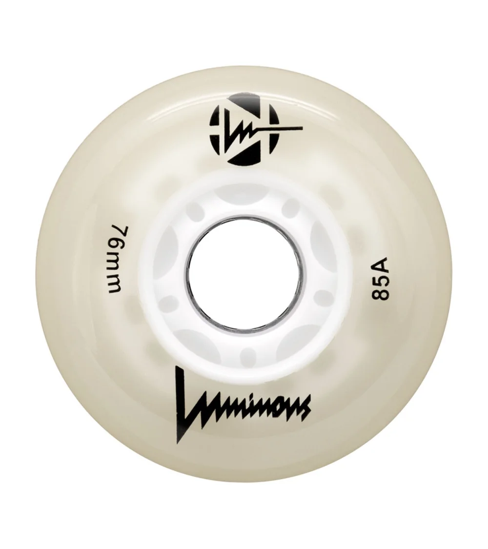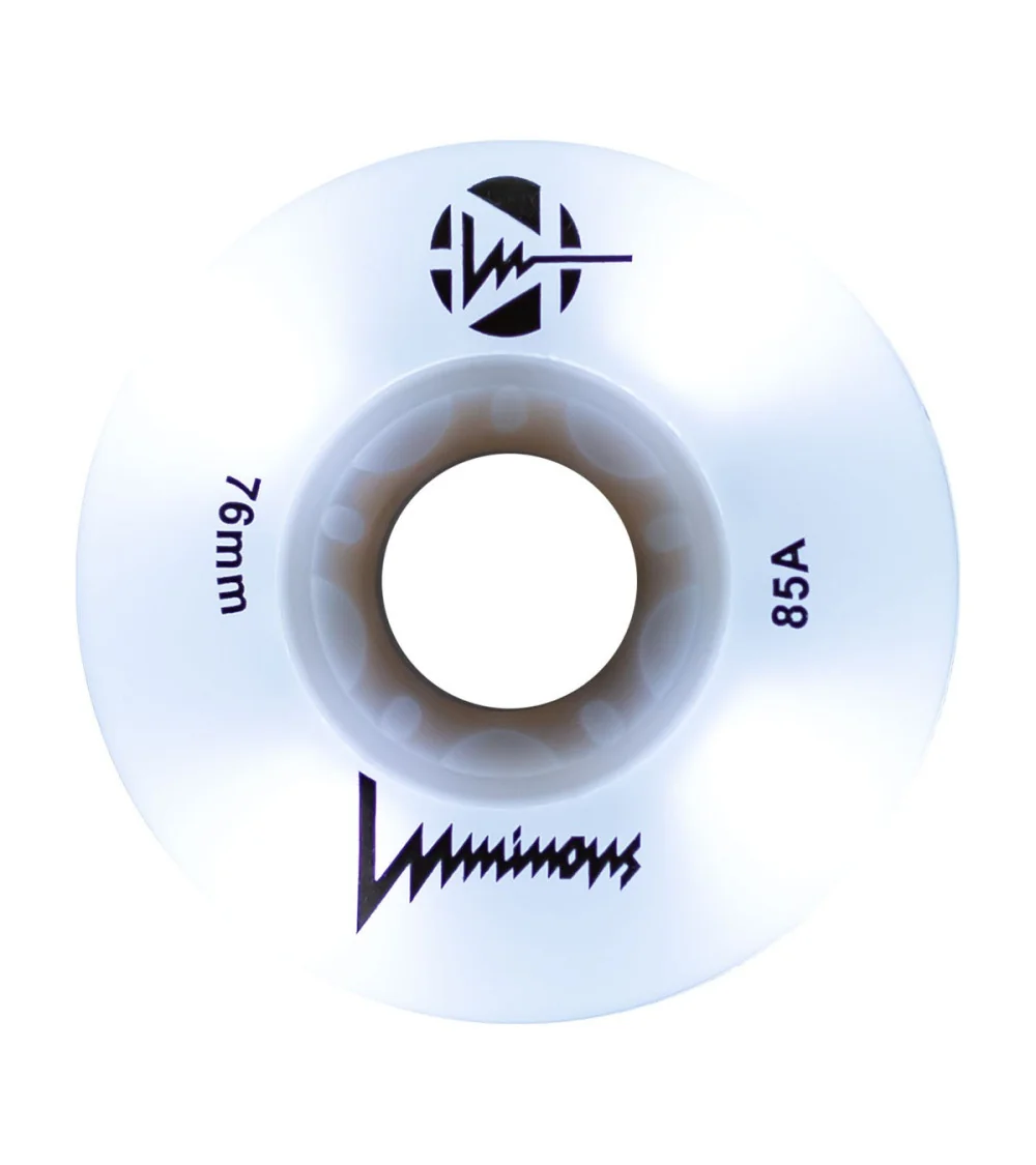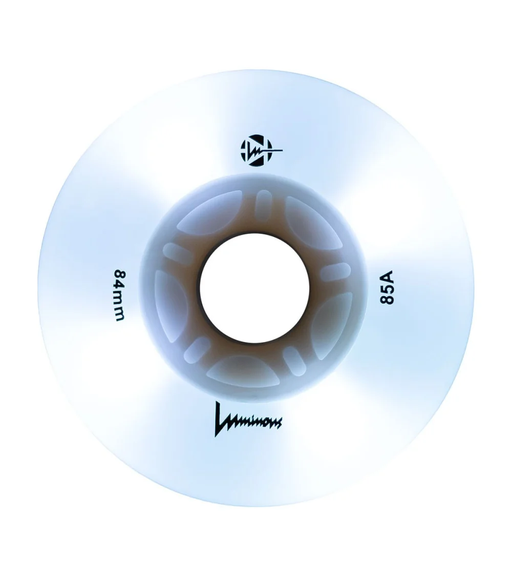 Ruedas LED luminosas con brillo blanco flourescente, disponibles en paquetes de 3 o 4 unidades. Con dureza 85A, ofrecen un resplandor limpio e intenso para máxima visibilidad, ideales para patinadores que quieren iluminar la noche.