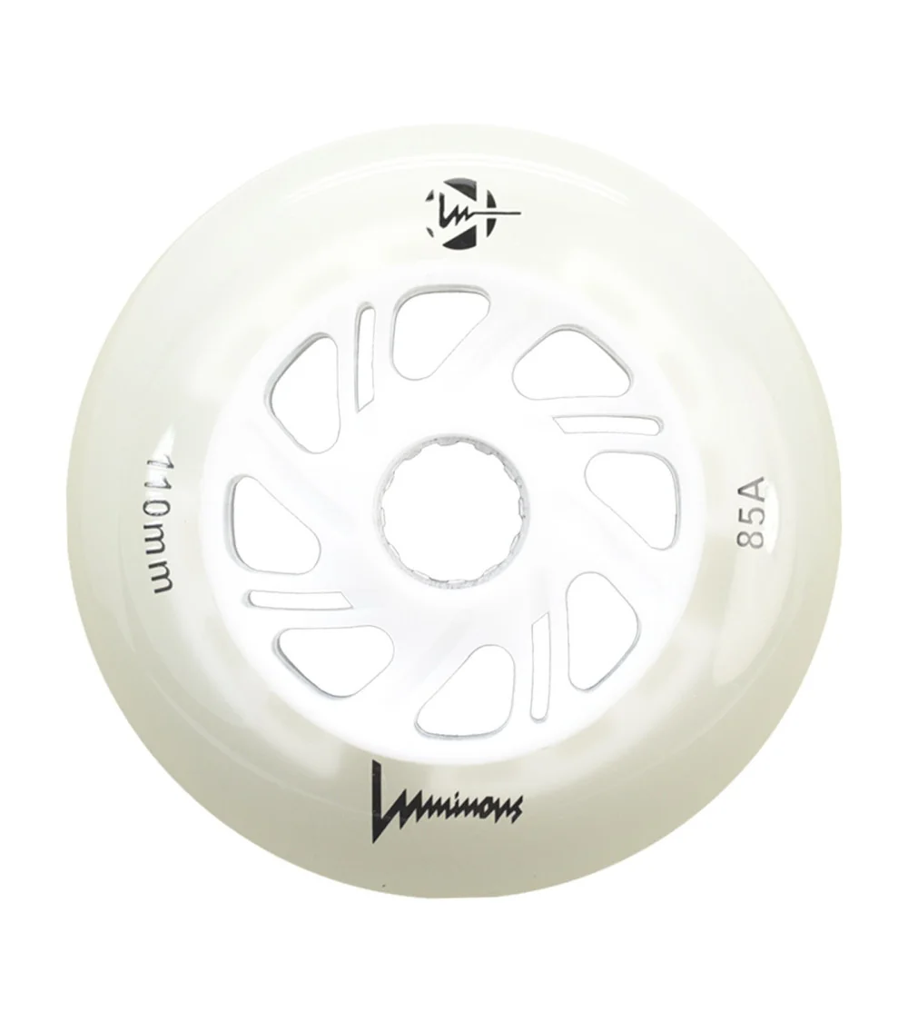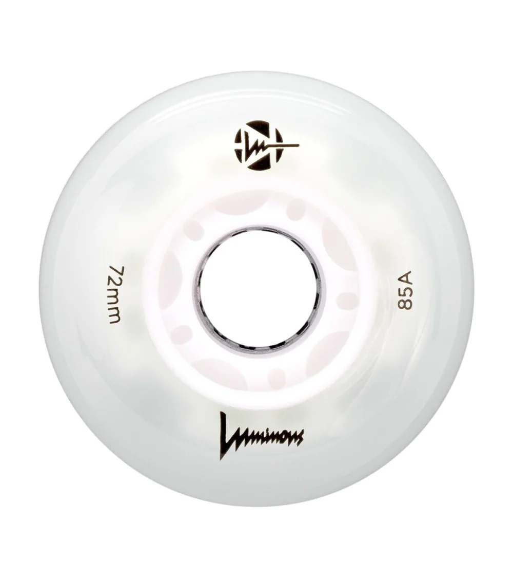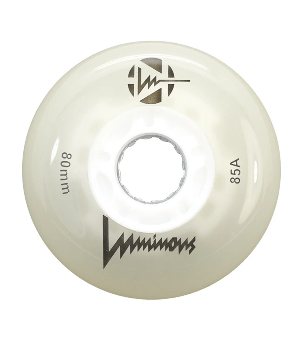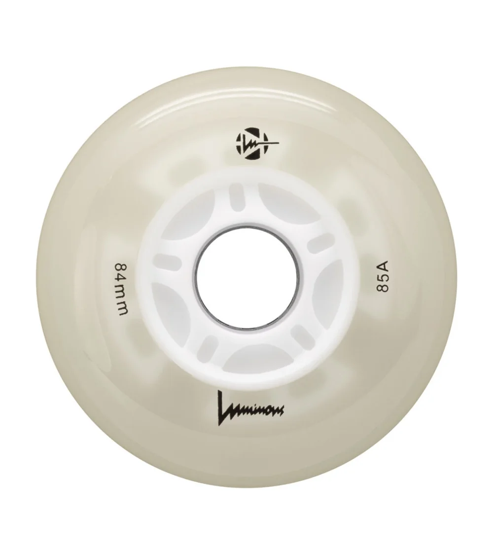 Ruedas LED luminosas con brillo blanco flourescente, disponibles en paquetes de 3 o 4 unidades. Con dureza 85A, ofrecen un resplandor limpio e intenso para máxima visibilidad, ideales para patinadores que quieren iluminar la noche.