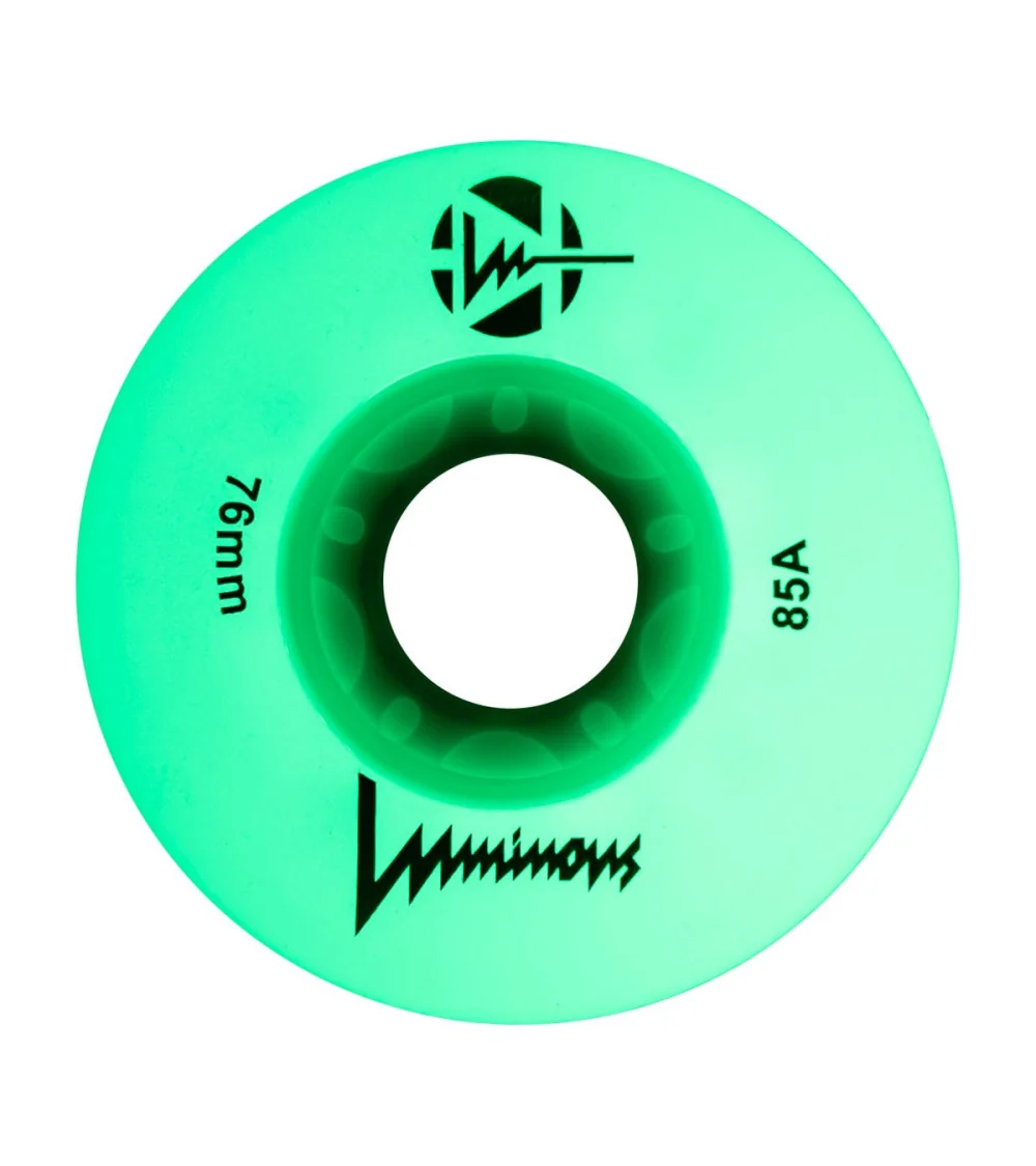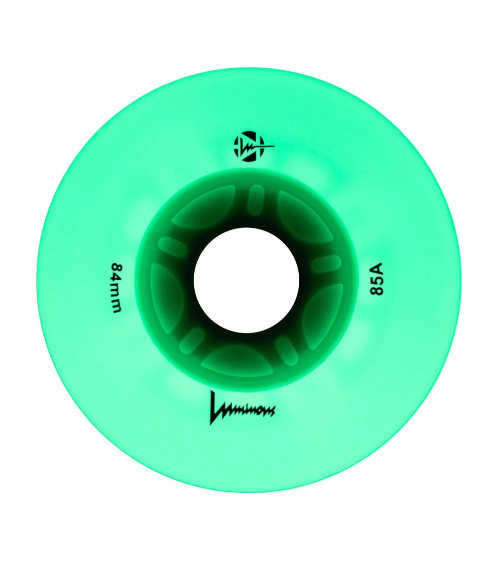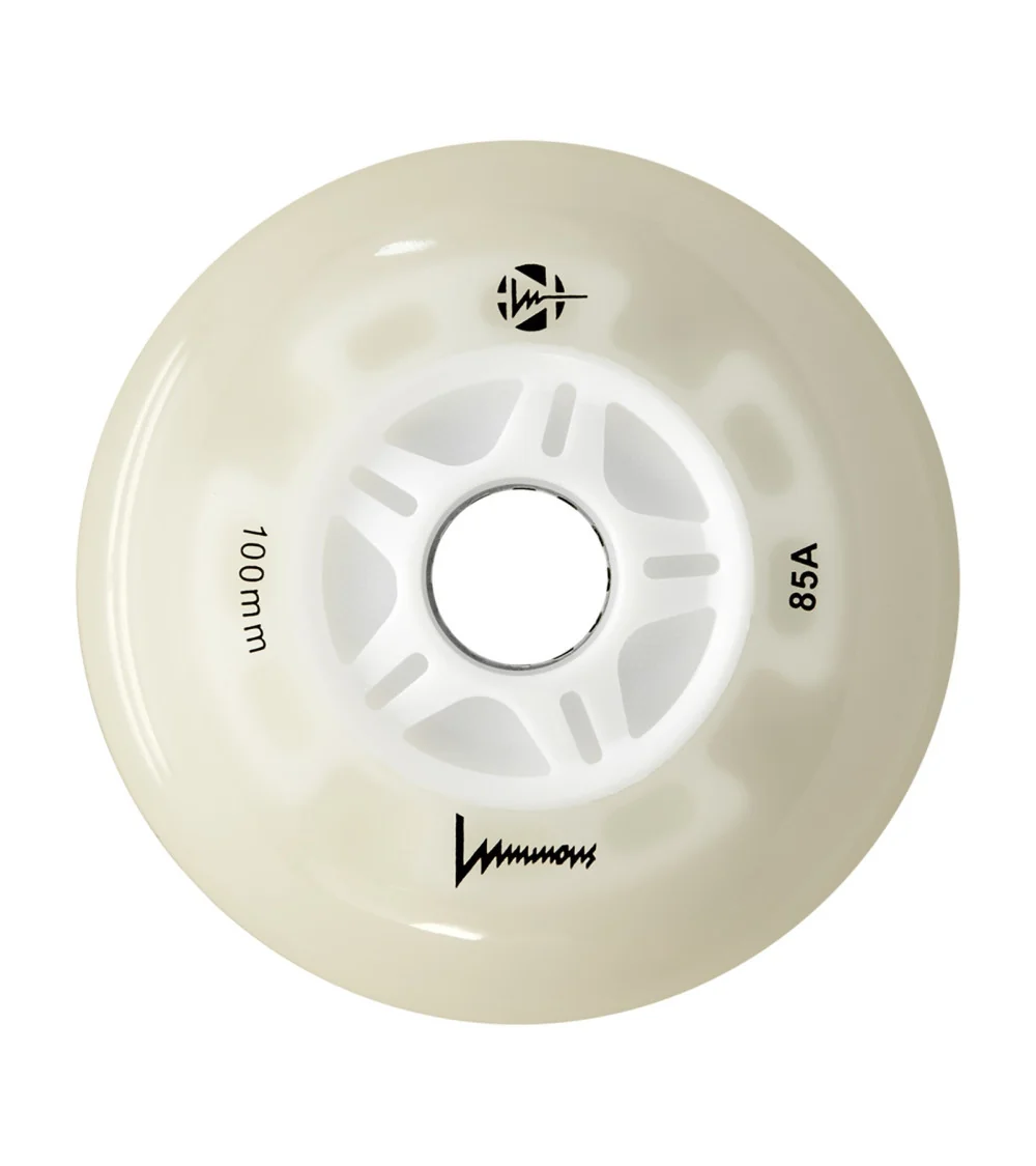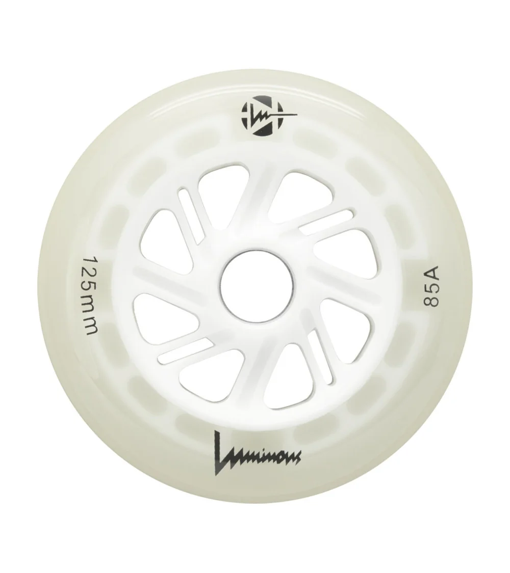 Ruedas LED luminosas con brillo blanco flourescente, disponibles en paquetes de 3 o 4 unidades. Con dureza 85A, ofrecen un resplandor limpio e intenso para máxima visibilidad, ideales para patinadores que quieren iluminar la noche.